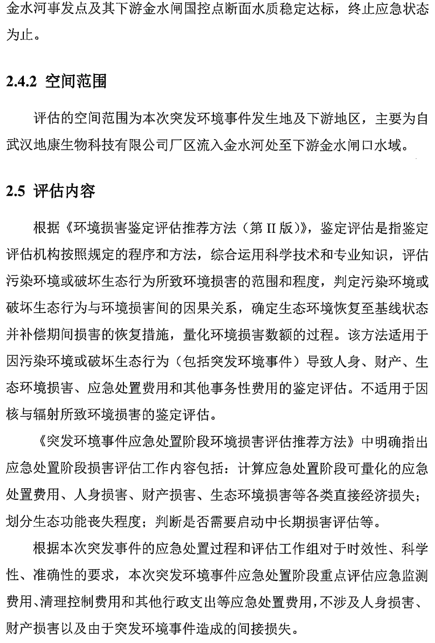 为妥善解决武汉地康生物科技有限公司“3.27”生物柴油泄漏生态环境损害赔偿事宜,根据中共中央办公厅、国务院办公厅《生态环境损害赔偿制度改革试点方案》,《湖北省生态环境损坏赔偿制度改革实施方案》(鄂办发[2018]40号)、《湖北省生态环境损害赔偿磋商办法(试行)》,《武汉市生态环境损害赔偿制度改革实施方案》)(武政规[2018]30号)以及生态环境损害赔偿权利人武汉市人民政府的指定和授权,武汉市生态环境局作为武汉市人民政府的代表,与赔偿义务人在平等、自愿的基础上就赔偿事宜进行磋商。武汉市生态环境局委托湖北省环境科学研究院出具的《武汉地康生物科技有限公司柴油泄漏事件环境损害评估报告》,确定的生物柴油泄露突发环境事件造成金水河生态环境损害的直接经济损失共计152100元,其中,应急监测费用34100元,应急处置费用92000元,其他行政事务性支出26000元。本事件中未涉及人身损害、财产损害和区域生态功能相关损失,环境污染损害鉴定评估费用7万元,上述费用共计222100元。