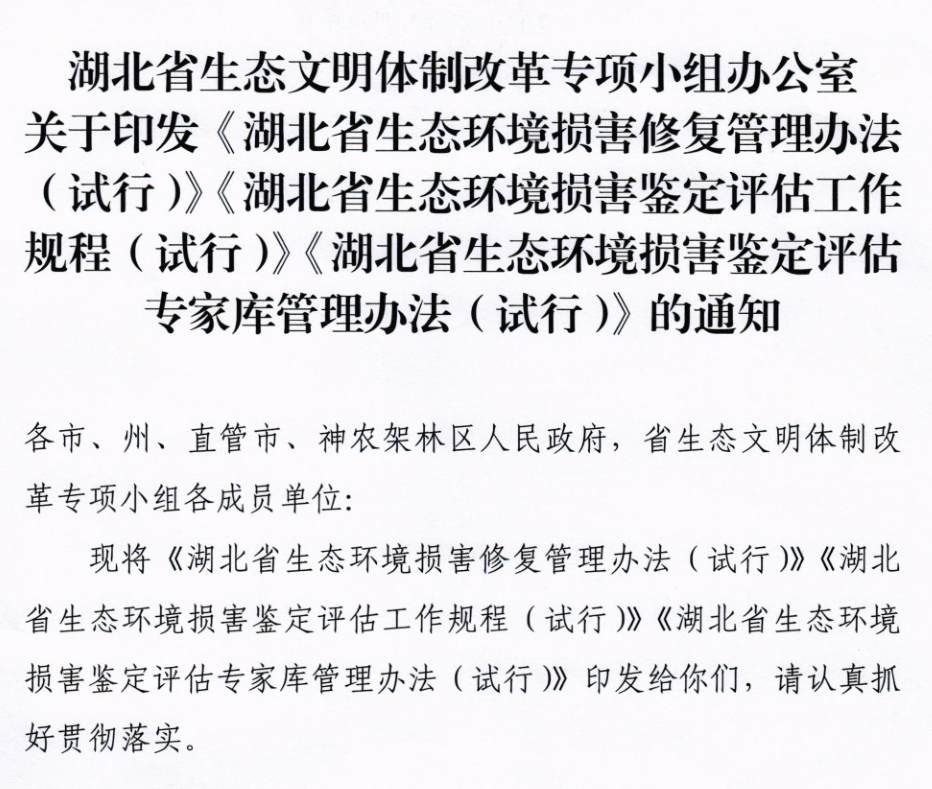 2017年,中央办公厅、国务院办公厅印发了《生态环境损害赔偿制度改革方案》后湖北省、武汉市也相继印发了《湖北省生态环境损害赔偿制度改革实施方案》《武汉市生态环境损害赔偿制度改革实施方案》等文件,对案件调查启动、鉴定评估、磋商、赔偿诉讼、生态环境修复、赔偿资金管理等方面都作出了明确规定。